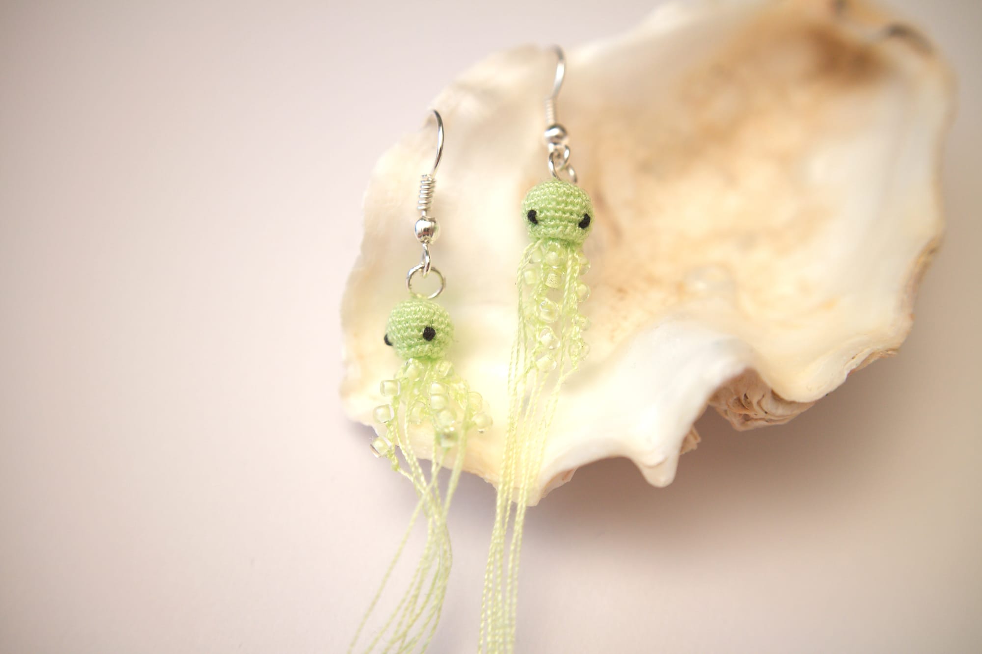 These tiny jellyfish dangle earrings are so cute. Each little jellyfish is crocheted using sewing thread and a 0.4mm crochet hook, with seed beads to decorate the tentacles.